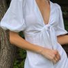 Button closures, a V-neckline with ties, and short elasticated flared sleeves will emphasize the collarbones and the neckline and add coquetry and femininity to your look.