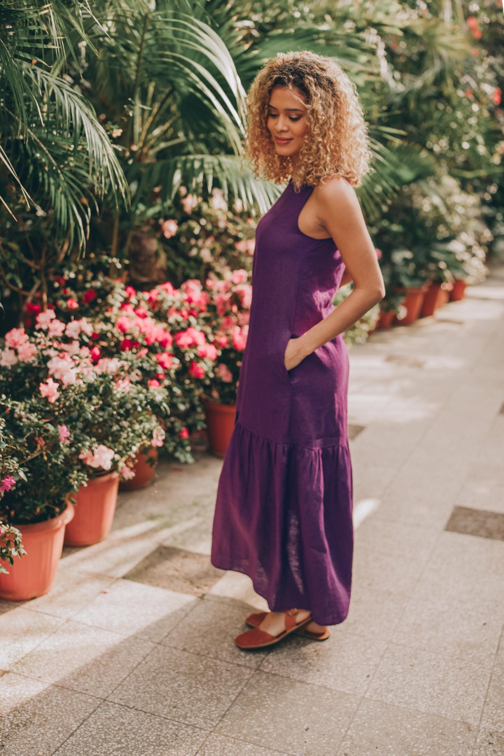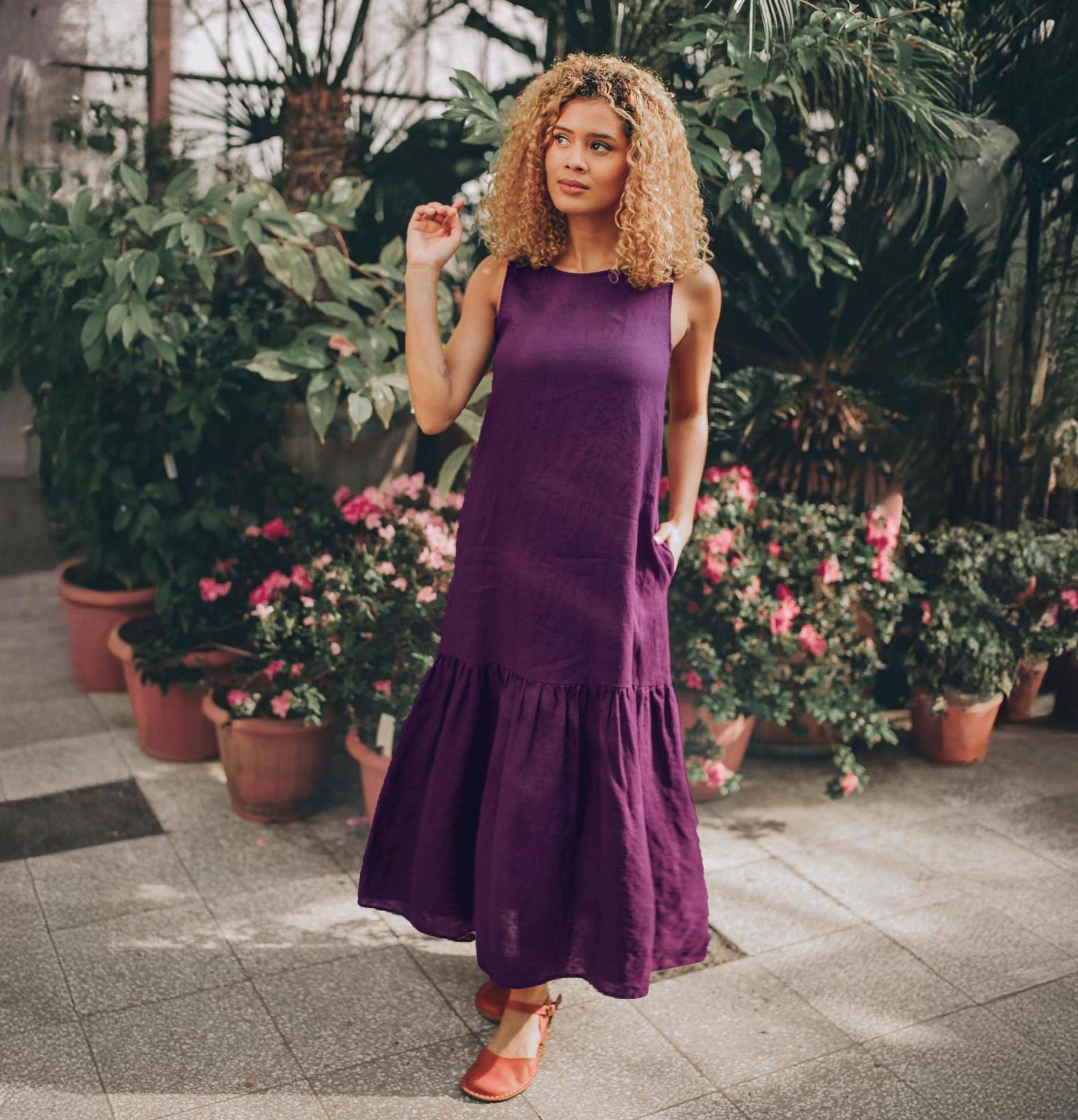 Effortlessly chic and breathable, this sleeveless linen midi dress is perfect for warm-weather days. Crafted from high-quality, lightweight linen, it offers a relaxed yet flattering fit. The flared hem adds movement and a touch of elegance, while the convenient side pockets bring practicality to the design. Falling at a midi length, this dress is ideal for casual outings. Pair it with sandals for everyday look. A timeless wardrobe staple for comfort and sophistication!