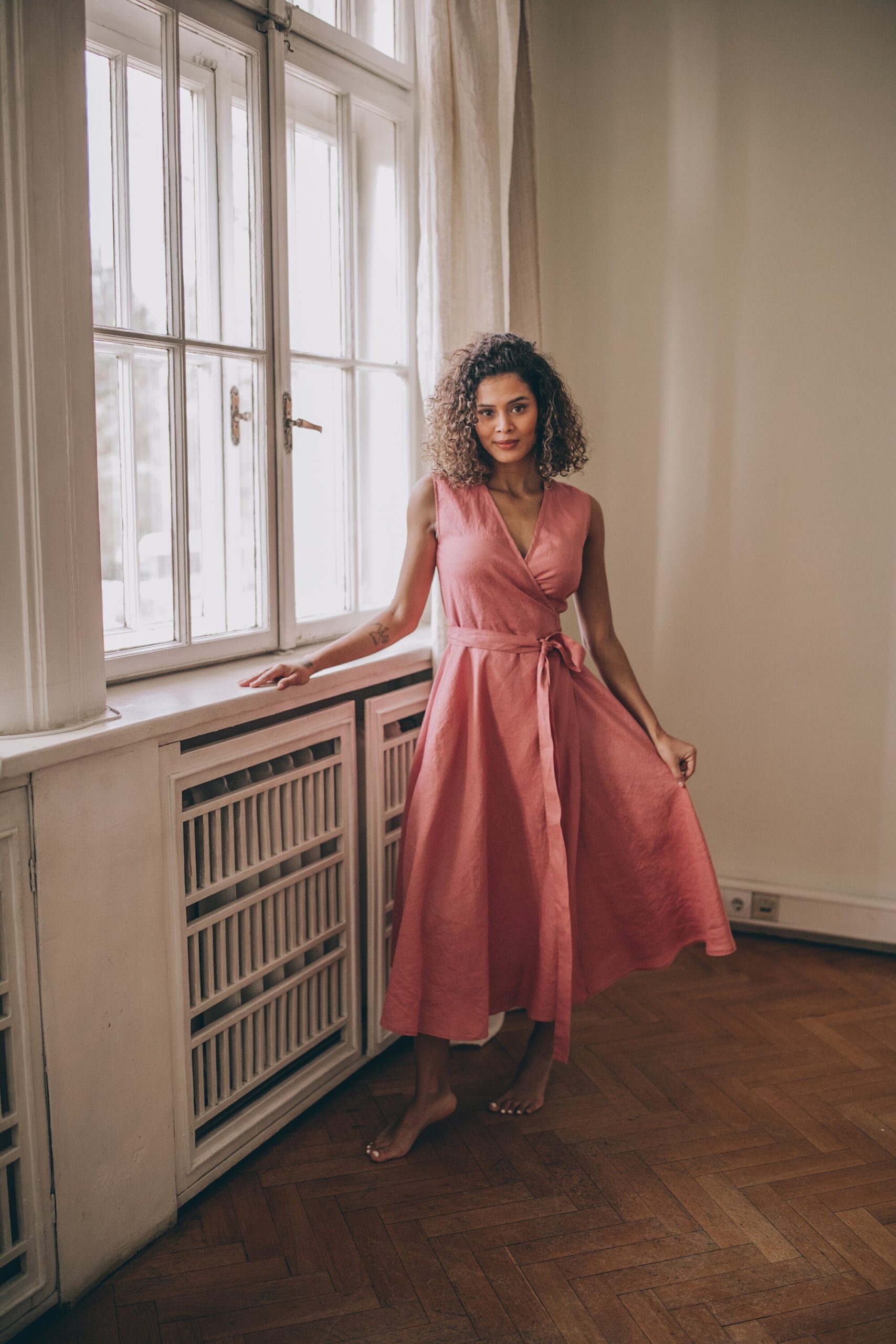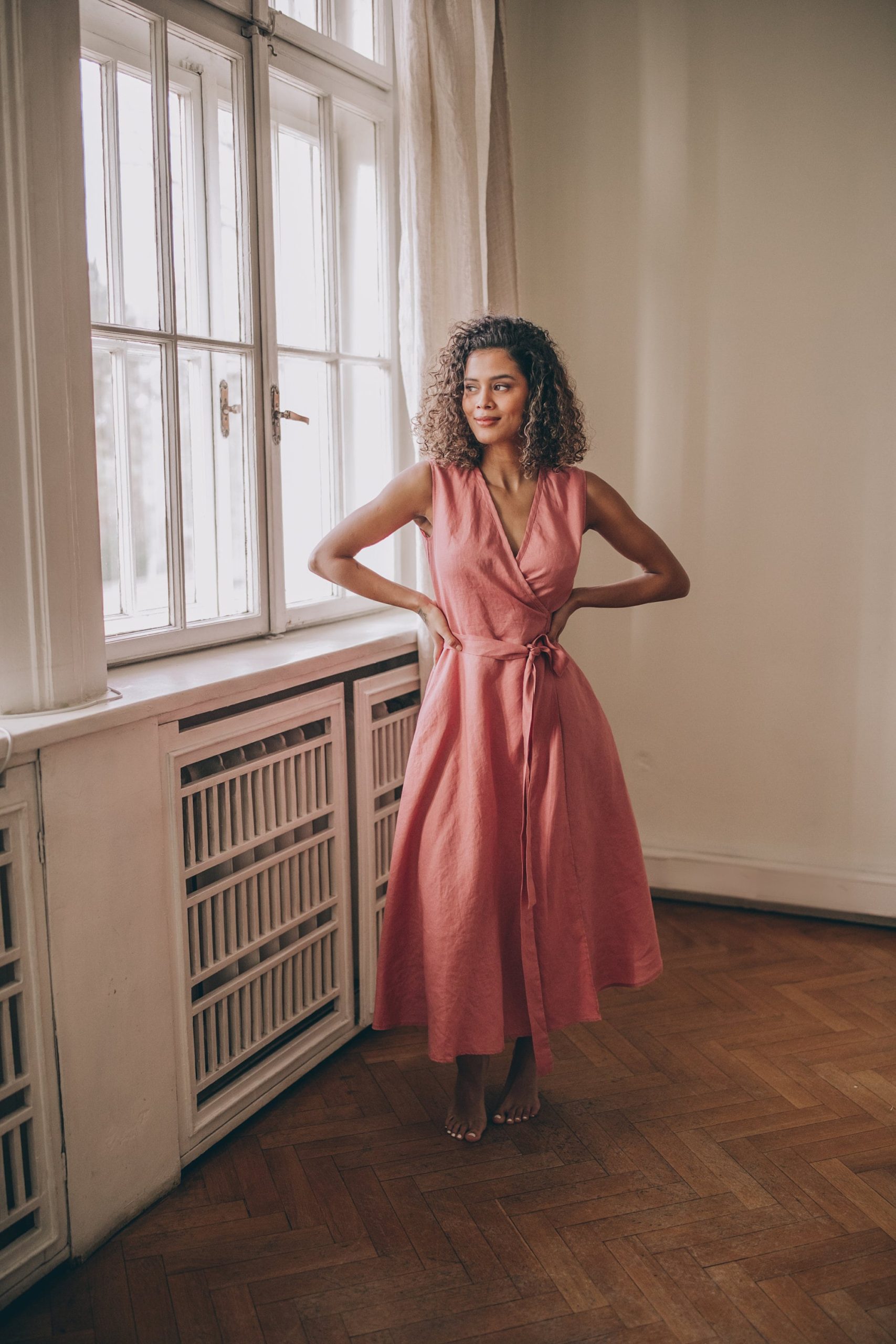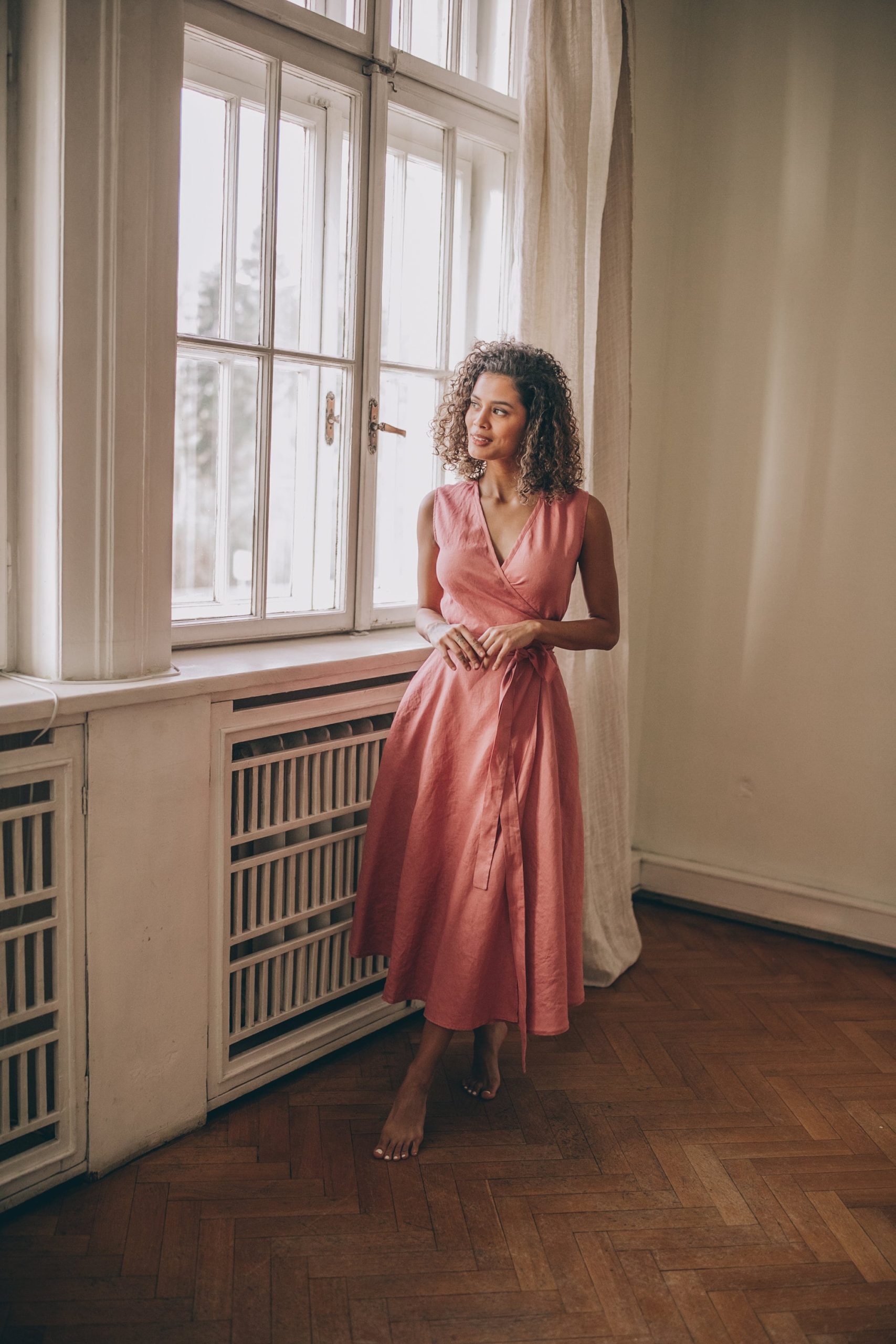 We would like to present you this sleeveless wrap linen dress with an elegant tie waist and a V-neck collar. Made of 100% high quality linen, this piece is available to order in multiple classic colors. Here to serve you for many seasons to come. Timeless elegance in its most graceful form.