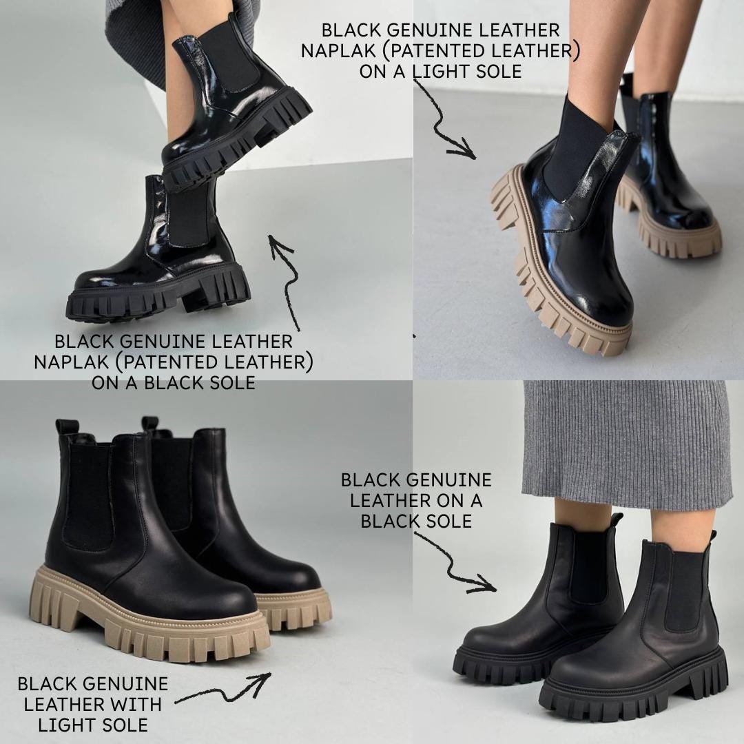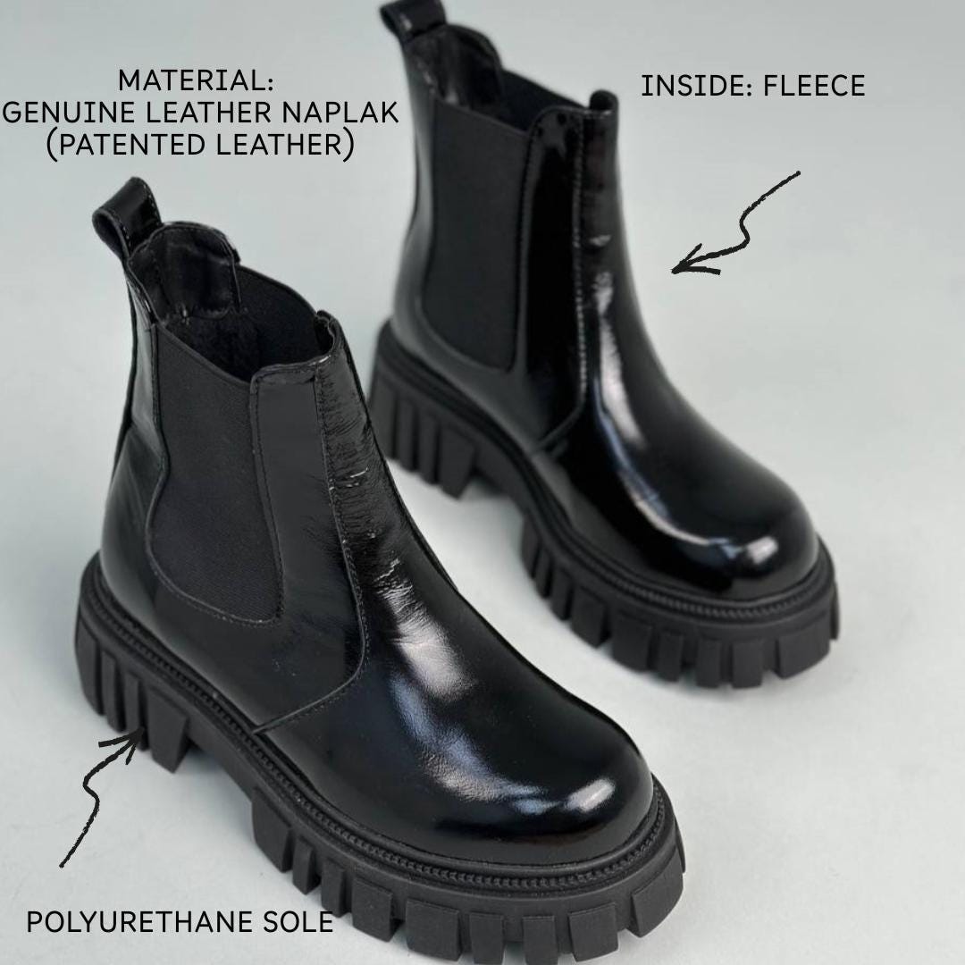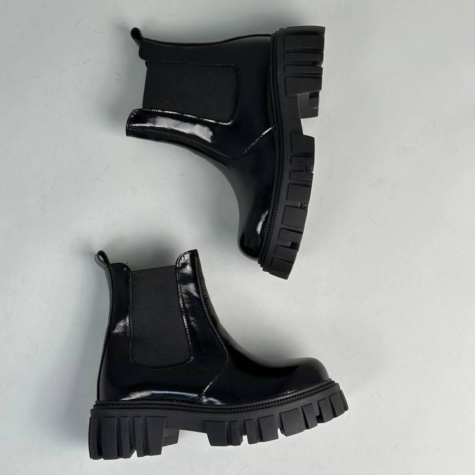 Step into the perfect blend of style and practicality with these black chelsea boots, designed to elevate your cold-weather wardrobe. Featuring a chunky platform and a lug sole, these womens boots offer both bold grunge appeal and reliable traction for winter days. Handcrafted in Ukraine from premium leather or patent naplak, they slip on easily while keeping your feet warm and comfortable.